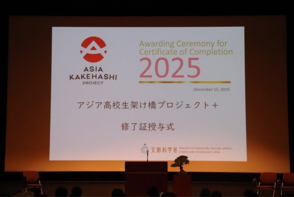 On 15th December 2025, Asia Kakehashi students of the 2025 cohort proudly participated in the Certificate Awarding Ceremony, marking the successful completion of the third phase of the Asia Kakehashi Project Plus program. The ceremony was held at the Ministry of Education, Culture, Sports, Science and Technology (MEXT), where completion certificates were awarded to 99 high school students who successfully concluded the program.